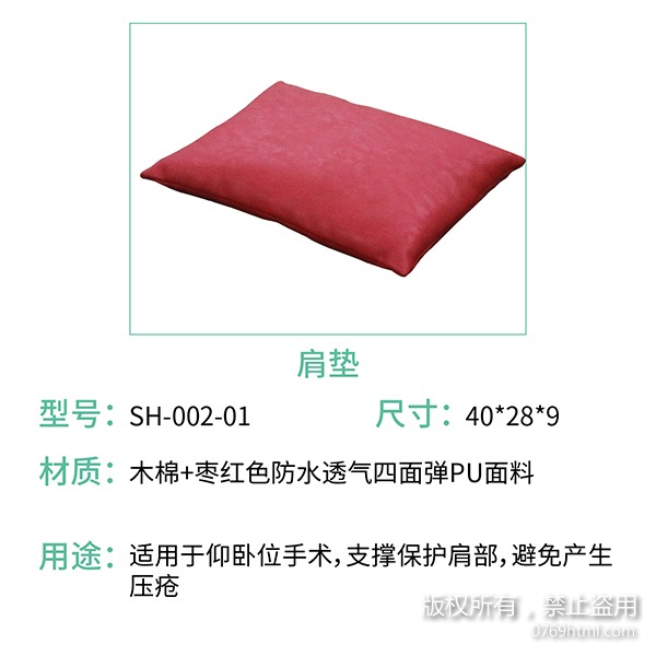 蒙泰海綿體位墊之肩墊是用來支撐保護(hù)肩部,避免壓瘡的產(chǎn)生,一般用于仰臥位手術(shù),選用棗紅色四面彈防水面料,與皮膚接觸有良好的依從性,內(nèi)里填充木棉,軟硬舒適,根據(jù)不同使用用途有多個尺寸。
