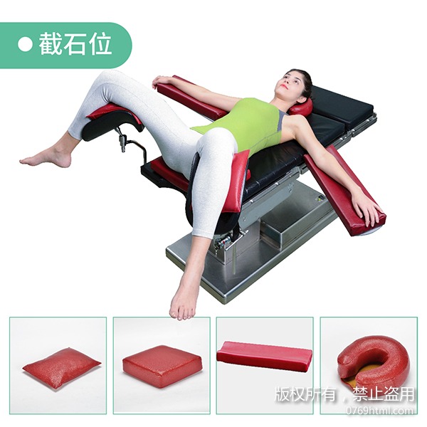 截石位姿勢(shì)是患者仰臥,臀部齊手術(shù)床緣,兩腿屈髖、雙膝置于腿架上,兩腿間角度約為60-90°。適用于直腸、肛門(mén)、會(huì)陰等部位手術(shù),接觸病床的頭部、肘部、臀部、腘窩部預(yù)防褥瘡需要使用手術(shù)體位墊,此方案包含高碗頭圈、上肢凹形體位墊、臀墊和記憶棉方墊。